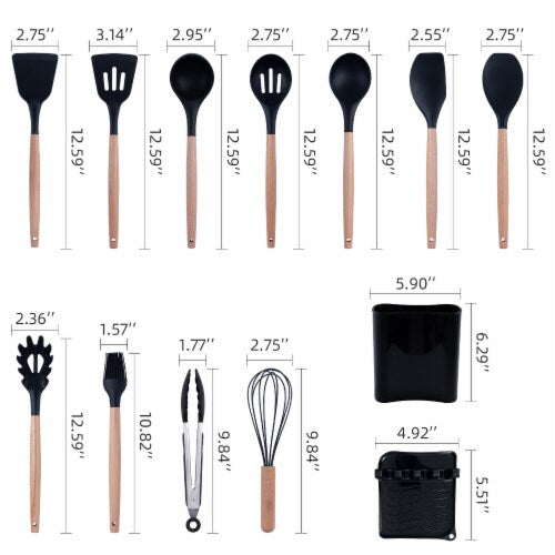 12-Piece Complete Set – Includes: Ladle, Slotted Spoon, Stirring Spoon, Flipper, Slotted Turner, Pasta Fork, Spatula, Scraper, Whisk, Tongs, Basting Brush, and a Matching Utensil Holder